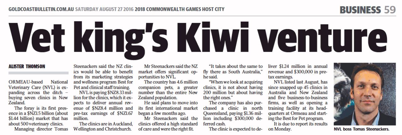 BRISBANE, August 29, 2016 - NVC was featured in the Saturday edition of the Gold Coast Bulletin. The article discusses our expansion into the New Zealand market with the acquisition of 7 general practice clinics. These clinics deliver a high standard of veterinary care which is the perfect fit for our business and clinic community.