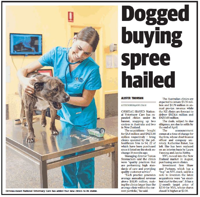 We are excited to announce the acquisition of two further veterinary clinics in Australia and two in New Zealand, due to be settled on or before 30 April 2017.